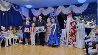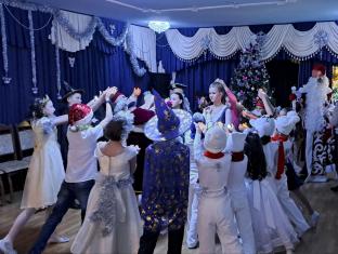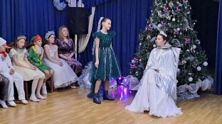 Ярко украшенный зал со сверкающей ёлкой, гирляндами и праздничными декорациями создал атмосферу настоящего чуда.