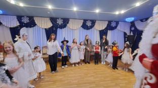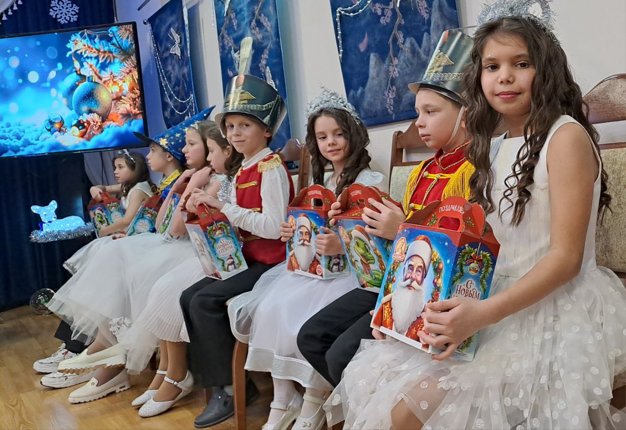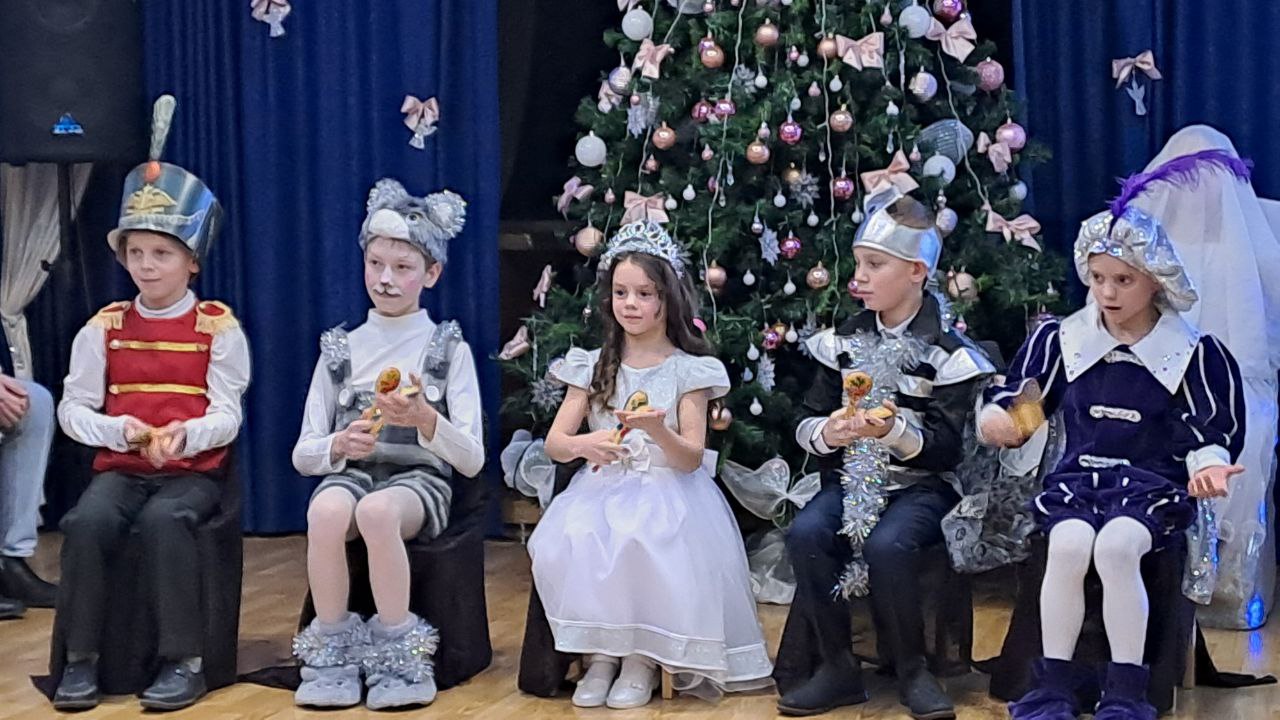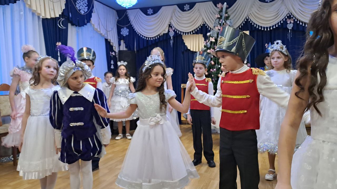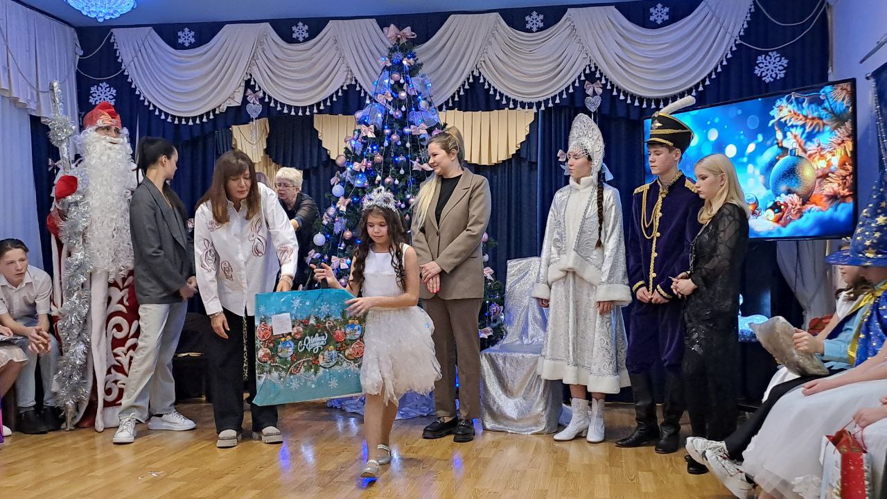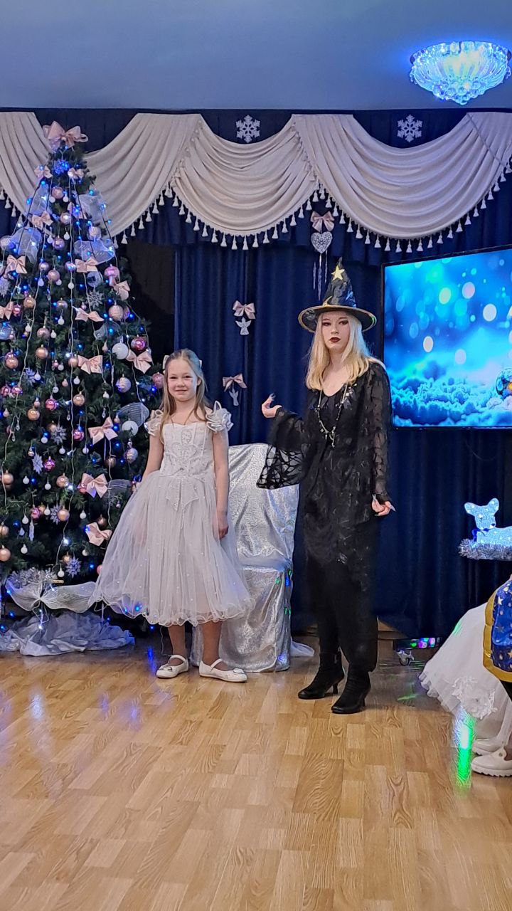 Ярко украшенный зал со сверкающей ёлкой, гирляндами и праздничными декорациями создал атмосферу настоящего чуда.