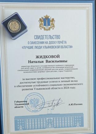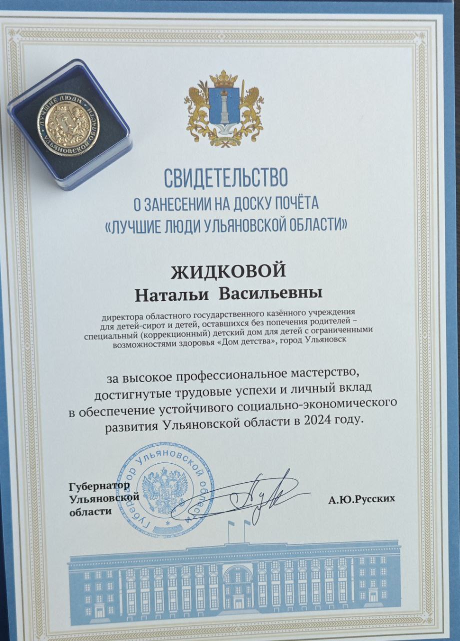 Наш директор Наталья Васильевна Жидкова безукоризненно руководит детским домом «Дом детства» вот уже 20 лет! И за высокое профессиональное мастерство, достигнутые трудовые успехи и личный вклад в обеспечение устойчивого социально-экономического развития Ульяновской области в 2024 году она удостоилась чести быть на доске почёта «ЛУЧШИЕ ЛЮДИ УЛЬЯНОВСКОЙ ОБЛАСТИ»!